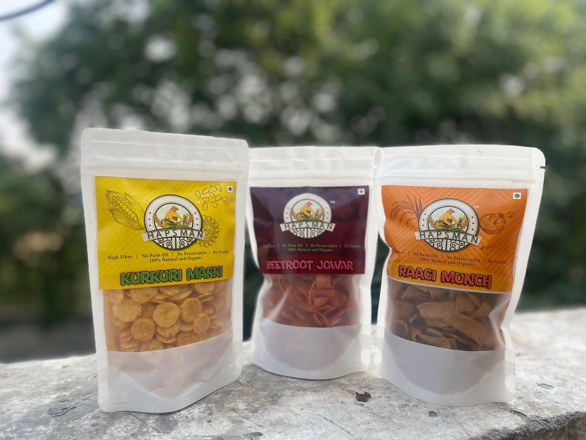 "Bajra Puff, Kurkuri Makki, and Beetroot Jowar are nutritious, flavorful snacks made from natural ingredients for guilt-free enjoyment."